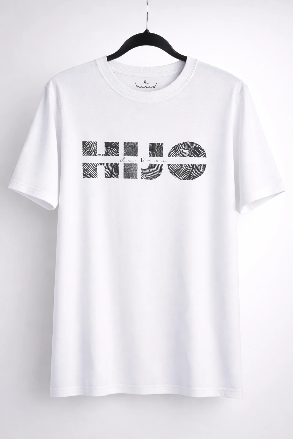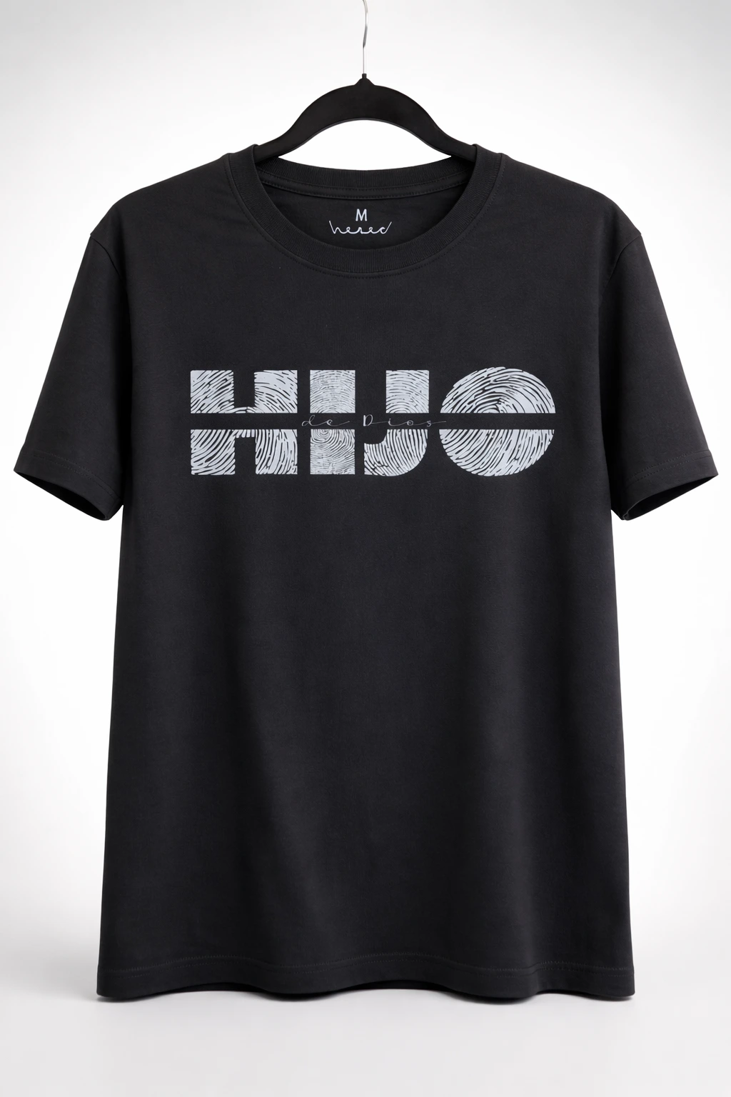 Remera negra lisa de cuello redondo, confeccionada en algodón de alta calidad. Cuenta con estampa en color con la frase “Hijo de Dios”.
